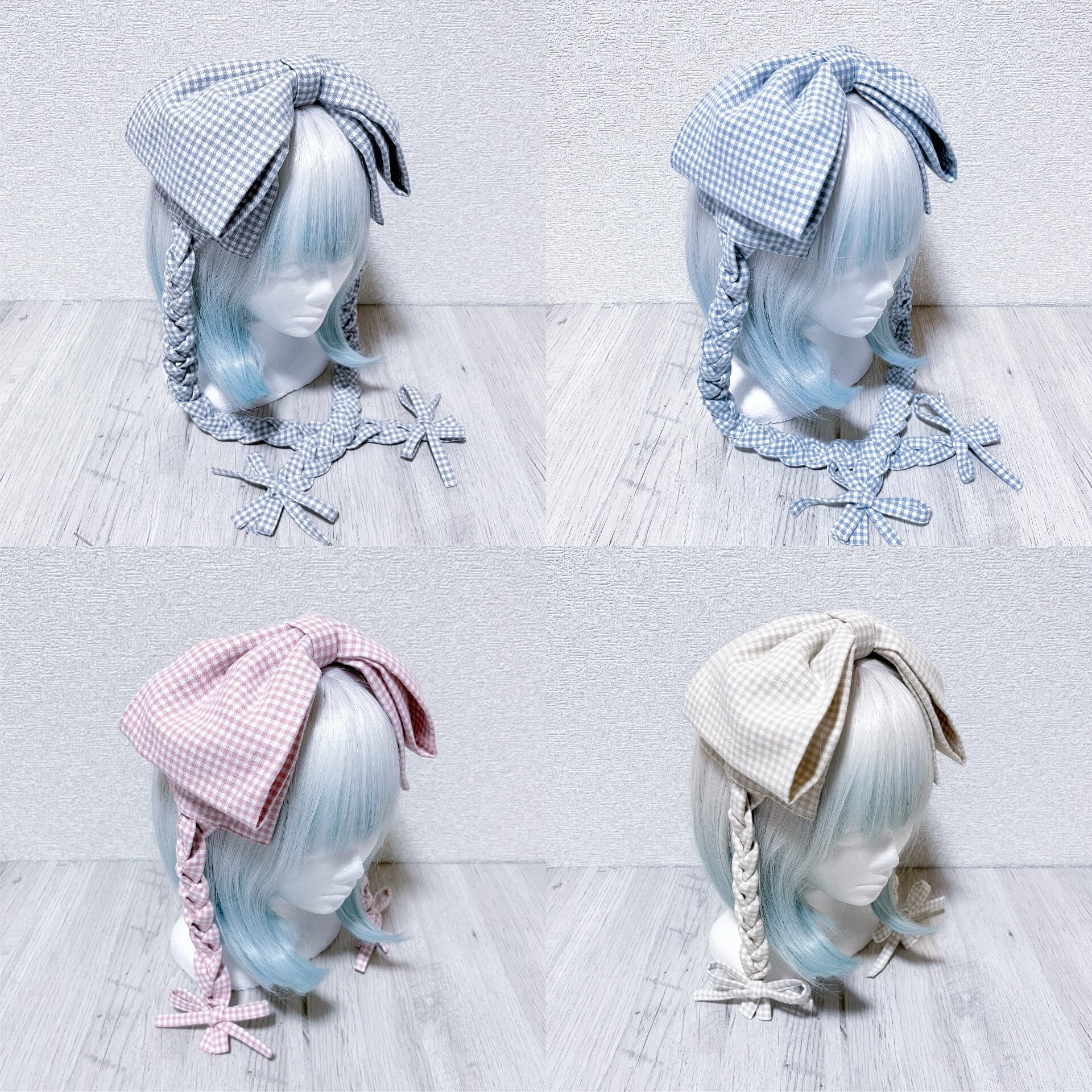 三つ編みビッグリボンヘッドドレス<くすみギンガムチェック/ivory>