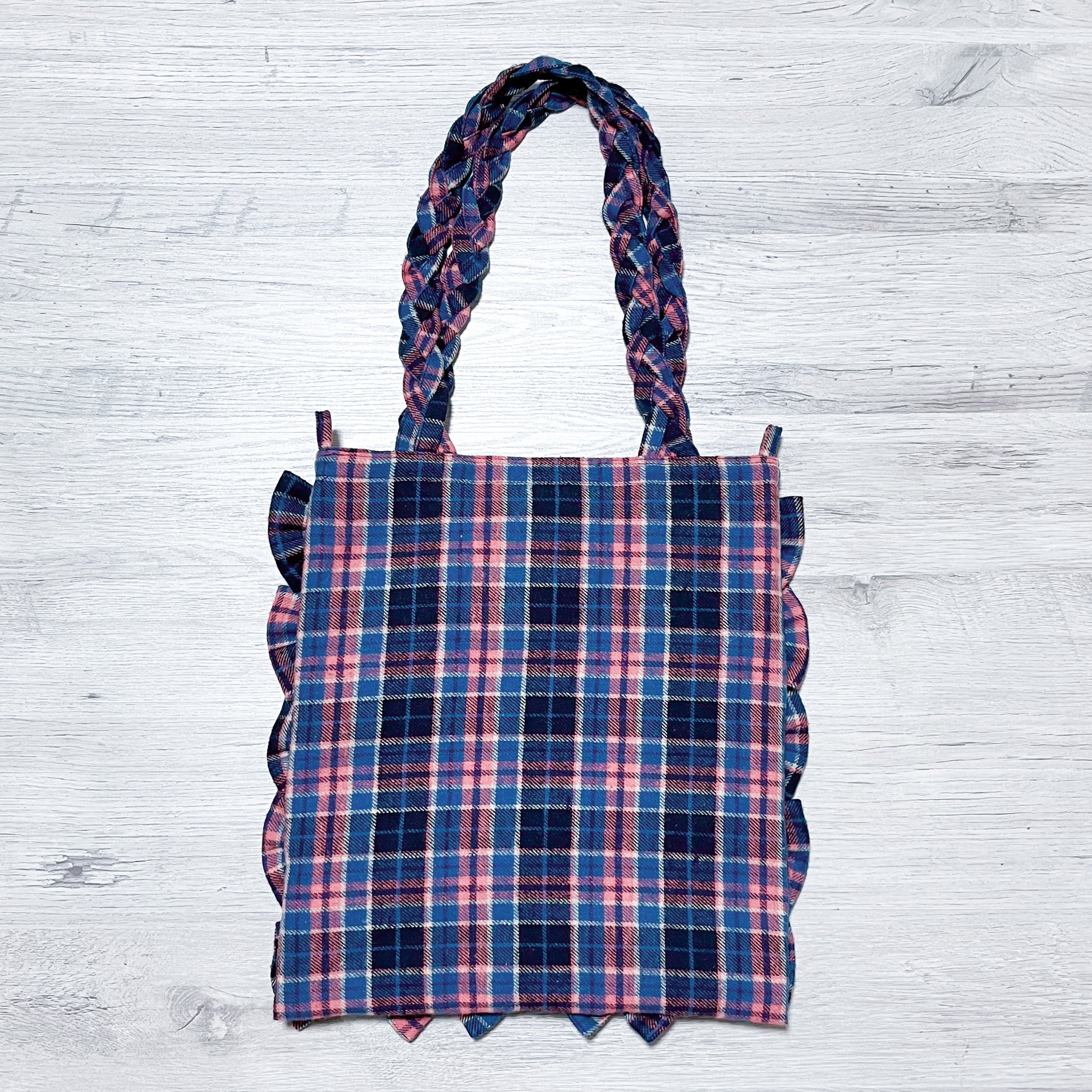 【B品】三つ編みリボントートバッグ<チェック/blue>